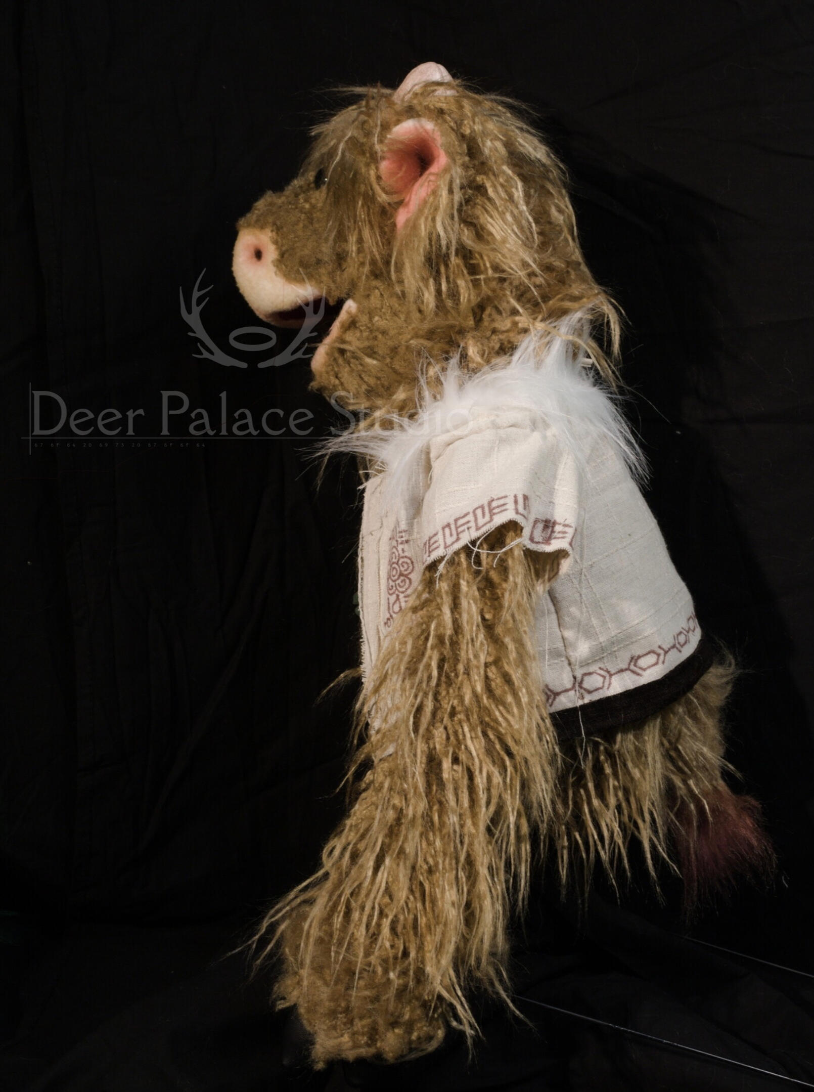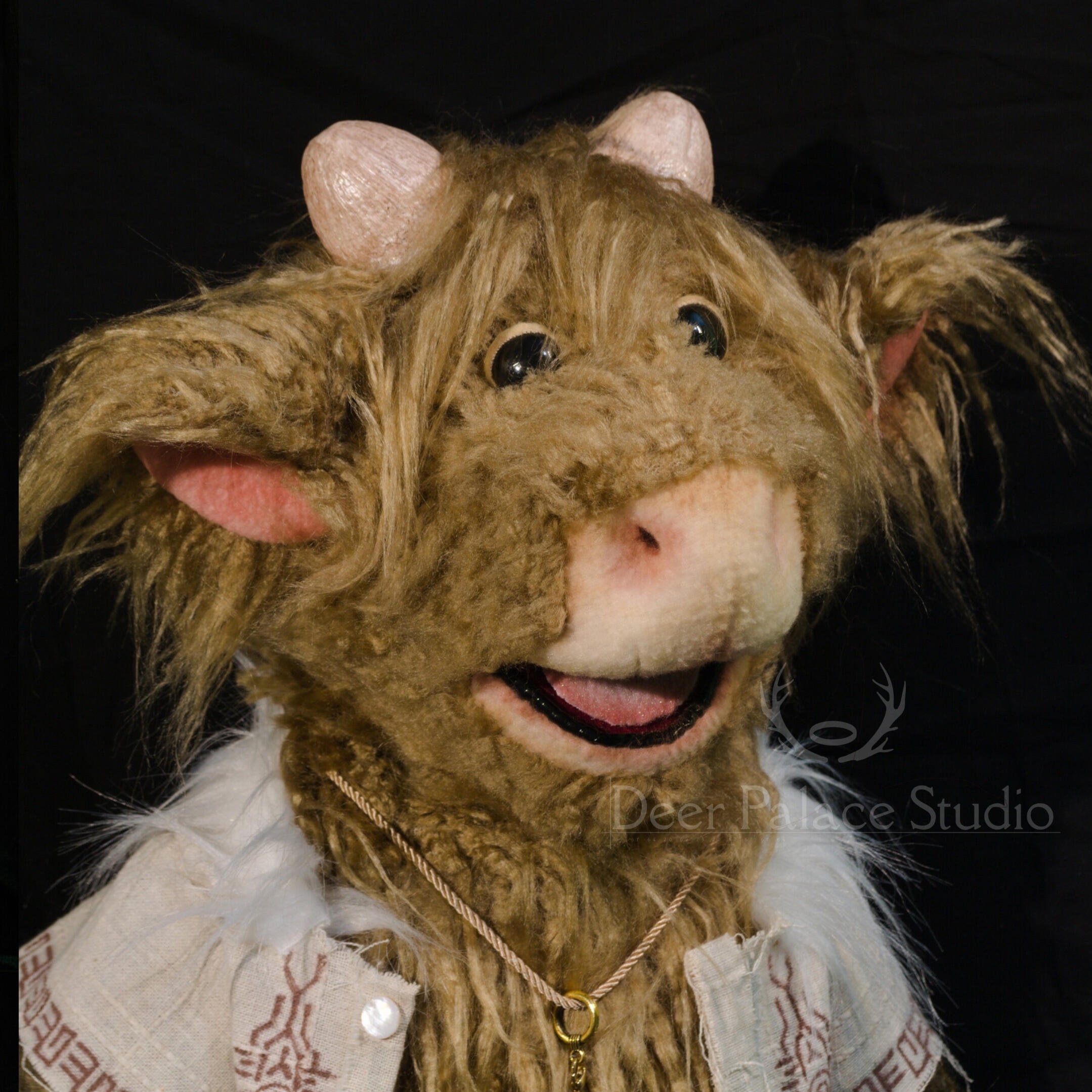 This highland cow, named Anders, was created from an original design as a personal piece for my portfolio and stage performances. He is both the most detailed puppet i have built and the highest quality, built to meet a professional standard for film and television puppetry. The base is made from reticulated foam then covered in fur, fleece, and faux leather for the hooves. Shading and finishings were applied with pastel, alcohol marker, fabric paint, and sprayable paints.
